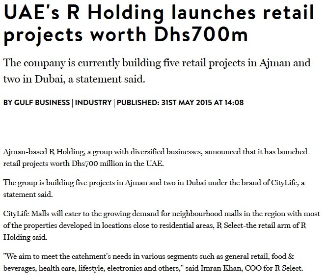 Ajman-based R Holding, a group with diversified businesses, announced that it has launched retail projects worth Dhs700 million in the UAE.